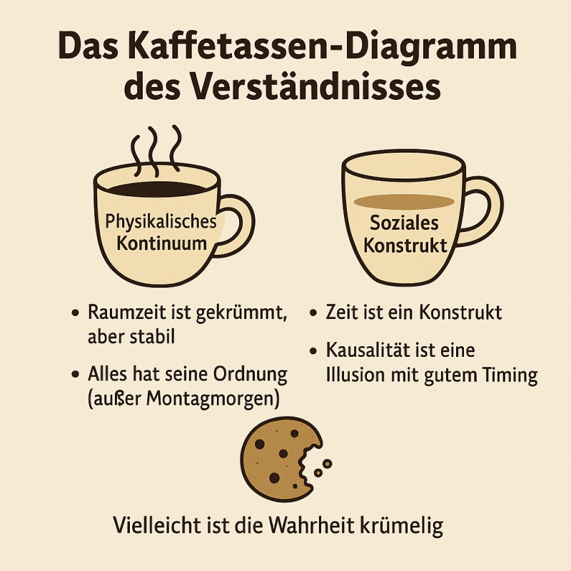 „Das Kontinuum ist ein fundamentales Konzept in der Physik – insbesondere in der Raumzeit-Theorie. Es beschreibt die ununterbrochene Struktur, in der sich Materie, Energie und Ereignisse bewegen. Anders gesagt: Ohne ein Kontinuum gäbe es keinen Zusammenhang zwischen Ursache und Wirkung – und keine Kaffeeflecken, die sich logisch von der Tasse bis zur Bluse ziehen.“